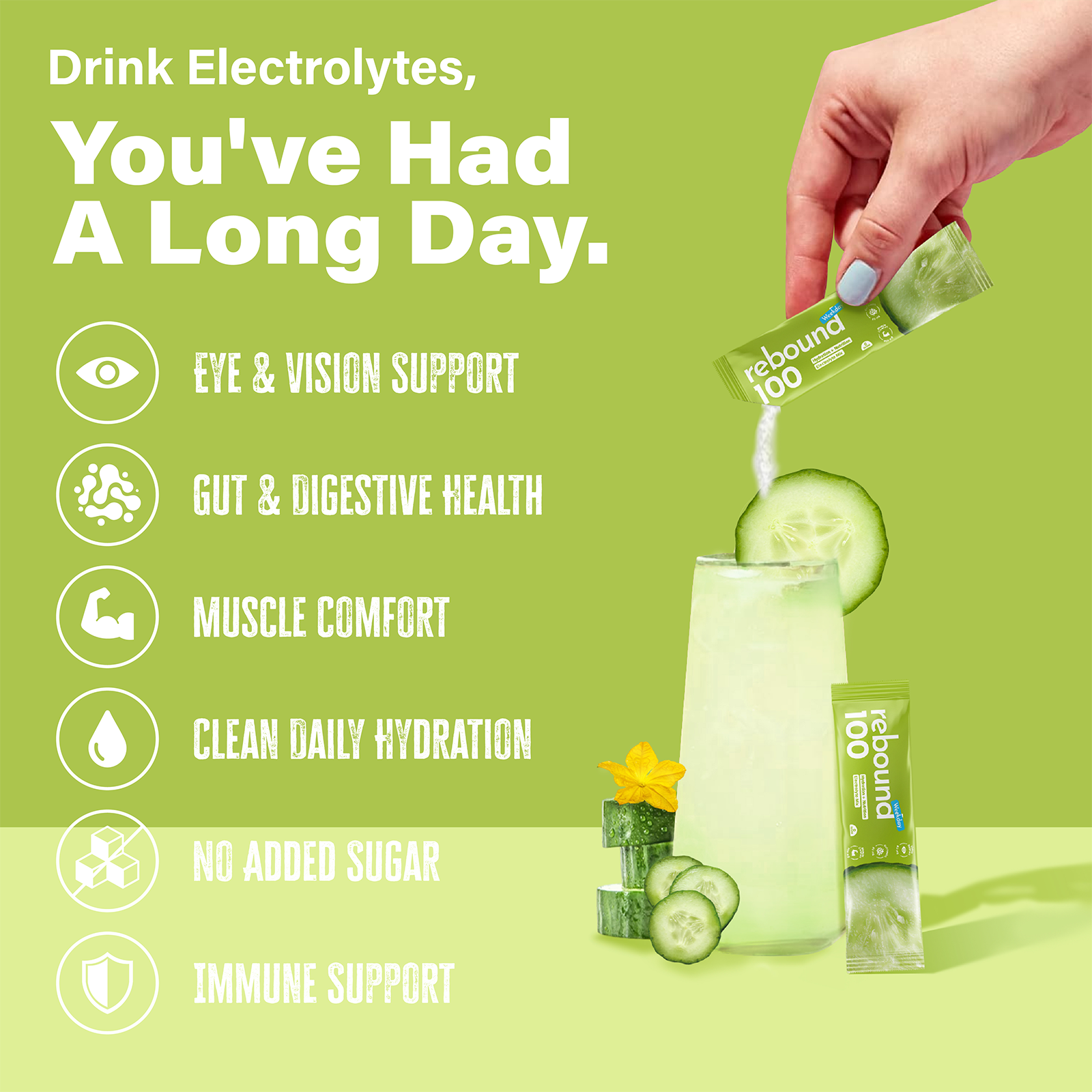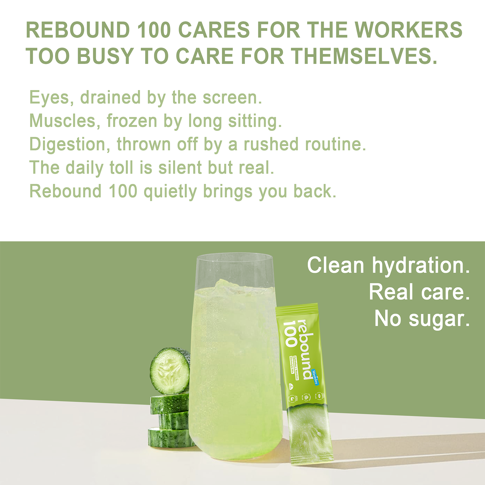 Fresh, cool, and functional — Rebound 100 Cucumber is crafted for modern desk warriors who spend long hours under screens, sitting still, or battling bloating after a rushed lunch.