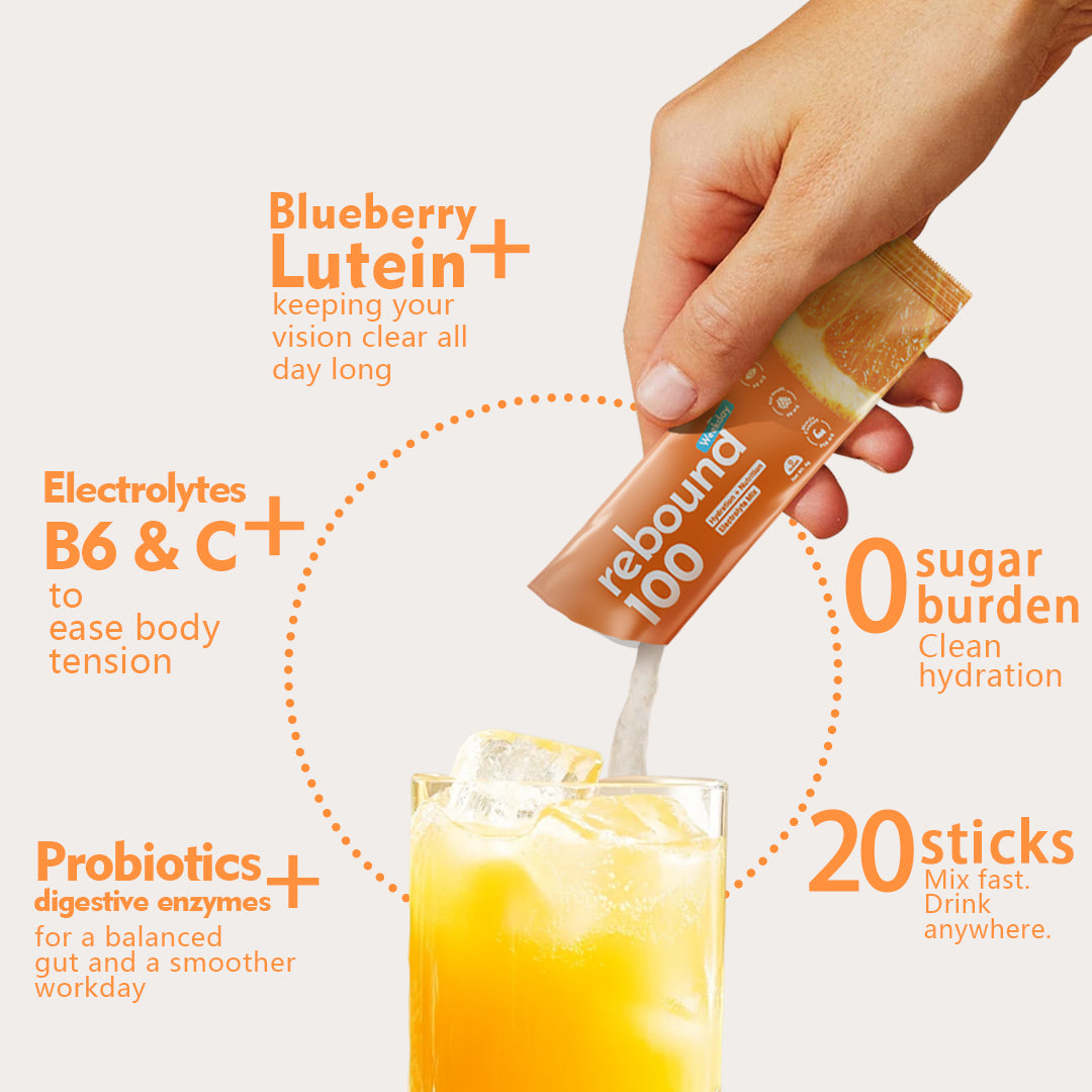 Created for today’s weekday warriors, Rebound 100 is a functional electrolyte mix designed to combat daily physical stress — from eye strain and poor digestion to muscle tension.